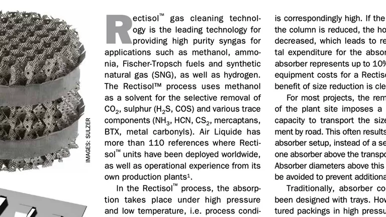 Rectisol™ gas cleaning technology is the leading technology for providing high purity syngas for applications such as methanol, ammonia, Fischer-Tropsch fuels and Synthetic Natural Gas, as well as Hydrogen. Air Liquide has more than 110 references where Rectisol™ units have been deployed worldwide and operational experience from their own production plants. Air Liquide Engineering & Construction experts discuss in the May-June issue of Nitrogen+Syngas Magazine how the application of commercially available structured packings in the absorber columns of a Rectisol™ unit results in significant capex and opex savings.